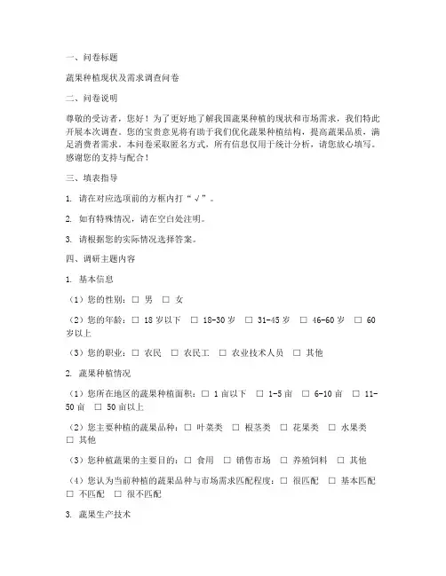 一、问卷标题蔬果种植现状及需求调查问卷二、问卷说明尊敬的受访者,您好!为了更好地了解我国蔬果种植的现状和市场需求,我们特此开展本次调查。