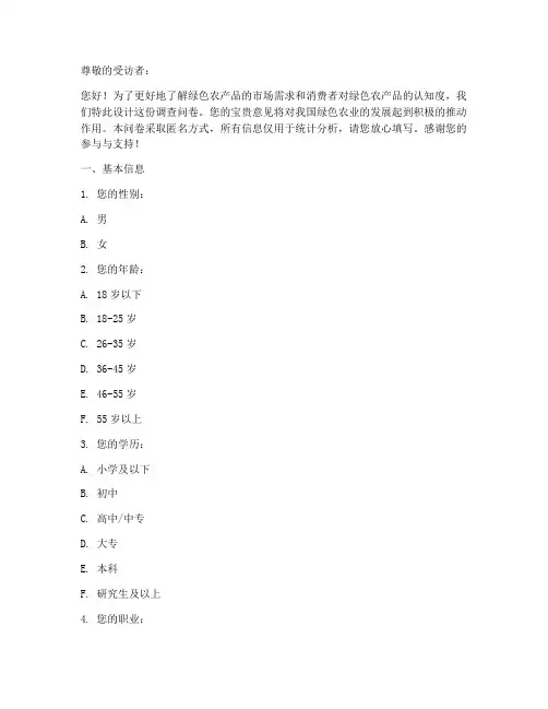 感谢您的参与与支持!一、基本信息1. 您的性别:A. 男B. 女2. 您的年龄:A. 18岁以下B. 18-25岁C. 26-35岁D. 36-45岁E. 46-55岁F. 55岁以上3. 您的学历:A. 小学及以下B. 初中C. 高中/中专D. 大专E. 本科F. 研究生及以上4. 您的职业:B. 企业员工C. 公务员D. 事业单位员工E. 自由职业者F. 其他二、绿色农产品认知与购买情况5. 您是否了解绿色农产品?A. 非常了解B. 了解一些C. 不太了解D. 完全不了解6. 您购买过绿色农产品吗?A. 经常购买B. 偶尔购买C. 很少购买D. 从未购买7. 您购买绿色农产品的主要原因是:A. 质量安全B. 健康环保C. 有机种植D. 其他(请说明)8. 当您购买绿色农产品时,以下因素中您最看重的是:B. 品种C. 产地D. 品牌E. 包装F. 其他(请说明)9. 您认为绿色农产品的价格是否合理?A. 非常合理B. 合理C. 一般D. 不太合理E. 完全不合理10. 您认为绿色农产品的推广和销售渠道是否便利?A. 非常便利B. 较为便利C. 一般D. 不太便利E. 完全不便三、绿色农产品市场评价与建议11. 您对绿色农产品的市场总体评价是:A. 非常满意B. 满意C. 一般E. 非常不满意12. 您认为绿色农产品市场存在哪些问题?A. 产品种类单一B. 价格偏高C. 产地标识不明确D. 市场监管不到位E. 其他(请说明)13. 您对绿色农产品市场的发展有哪些建议?A. 加强产品研发和创新B. 优化销售渠道和推广策略C. 完善市场监管体系D. 提高产品质量和安全性E. 其他(请说明)感谢您在百忙之中抽出时间填写这份问卷,您的宝贵意见对我们非常重要。