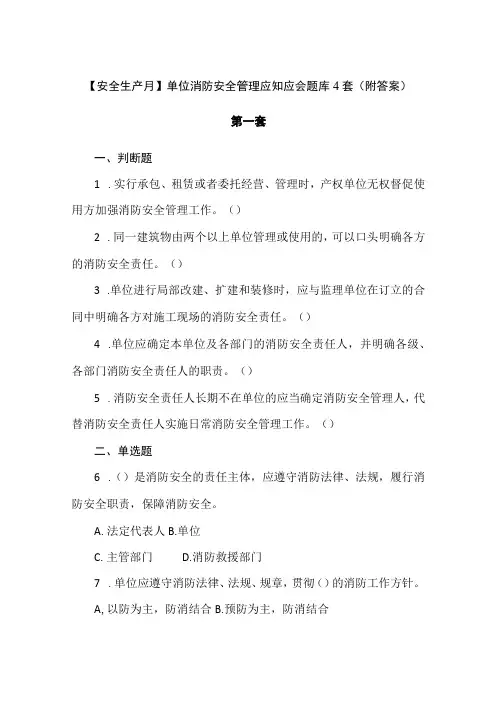 【安全生产月】单位消防安全管理应知应会题库4套(附答案)第一套一、判断题1.实行承包、租赁或者委托经营、管理时,产权单位无权督促使用方加强消防安全管理工作。
