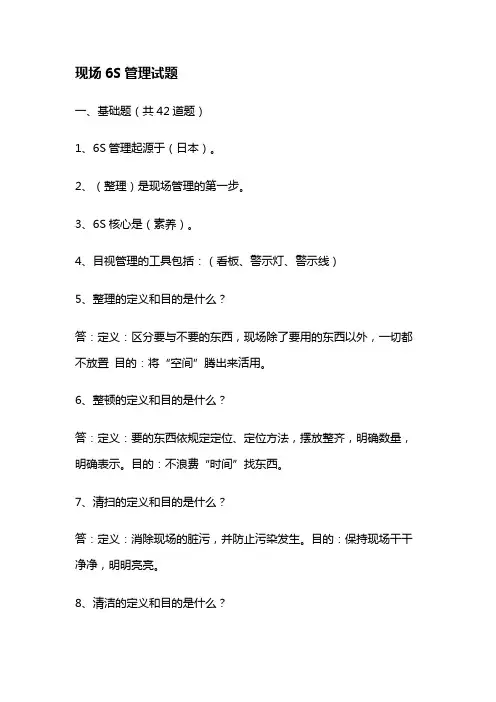 现场6S管理试题一、基础题(共42道题)1、6S管理起源于(日本)。