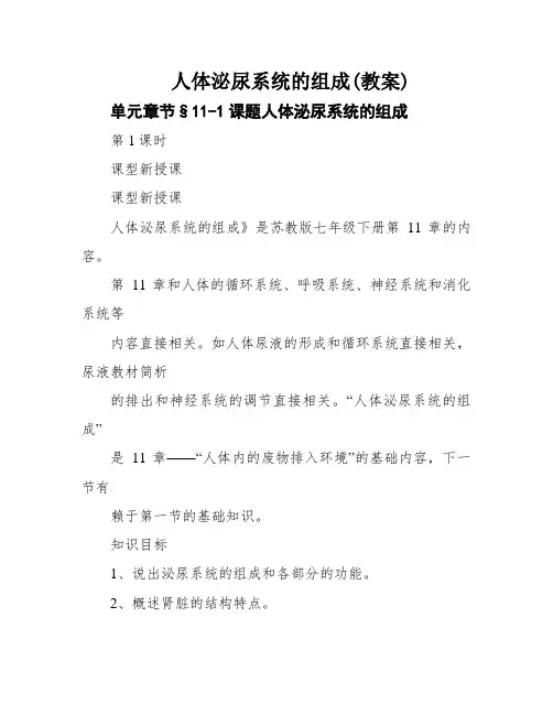 人体泌尿系统的组成(教案)单元章节§11-1课题人体泌尿系统的组成第1课时课型新授课课型新授课人体泌尿系统的组成》是苏教版七年级下册第11章的内容。