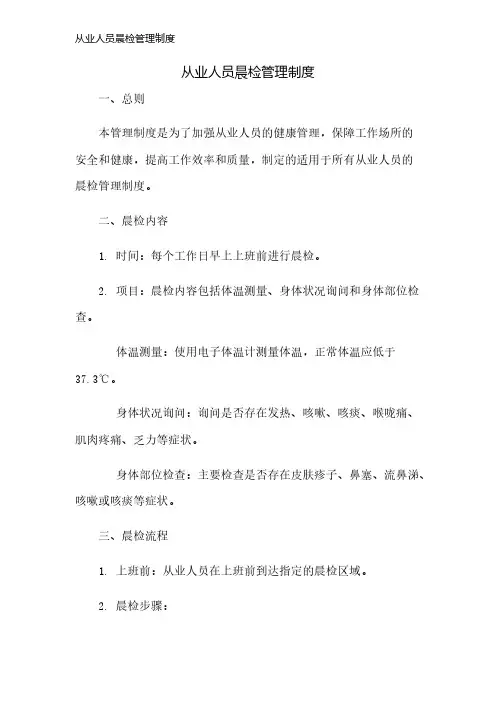 从业人员晨检管理制度晨检管理制度一、晨检管理制度的目的及适用范围1·1 目的:为确保从业人员健康,提高工作效率,营造良好的工作环境,制定本晨检管理制度。