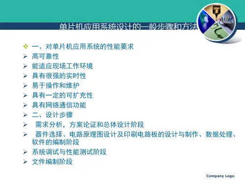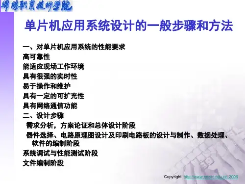 二、单片机系统设计方法1.需求分析:首先明确设计的目标和具体需求,了解所需的功能和性能要求。