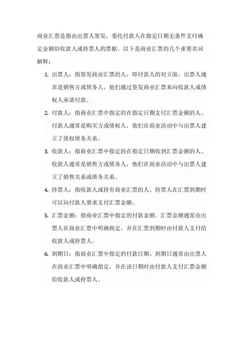 1. 商业汇票的基本概念商业汇票是指债务人(也称作出票人)通过签发一份书面文档,向债权人(即收款人)许诺在特定日期或期限内支付一定金额的货币。