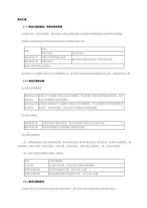 商业汇票的知识点总结一、商业汇票的定义及特点商业汇票是一种以商业交易或者商业活动为基础的、具有一定金额的支付和偿付凭证。