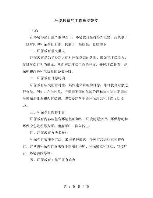 学校环境教育工作总结一、引言环境教育是培养学生环保意识和环境保护能力的重要途径,也是学校教育工作的一项重要内容。