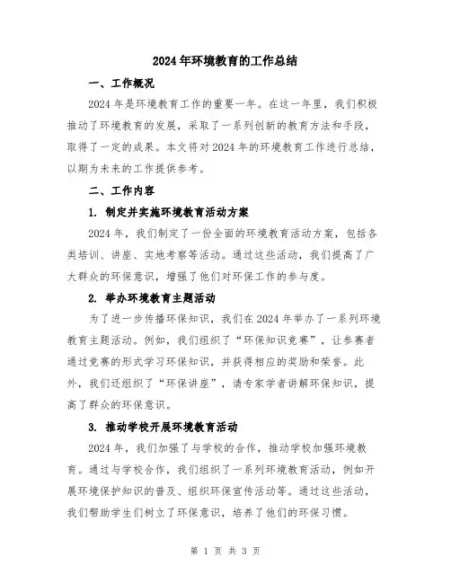 2024年小学环境教育工作总结范文一、引言在2024年,小学环境教育工作取得了一定的进展和成果。