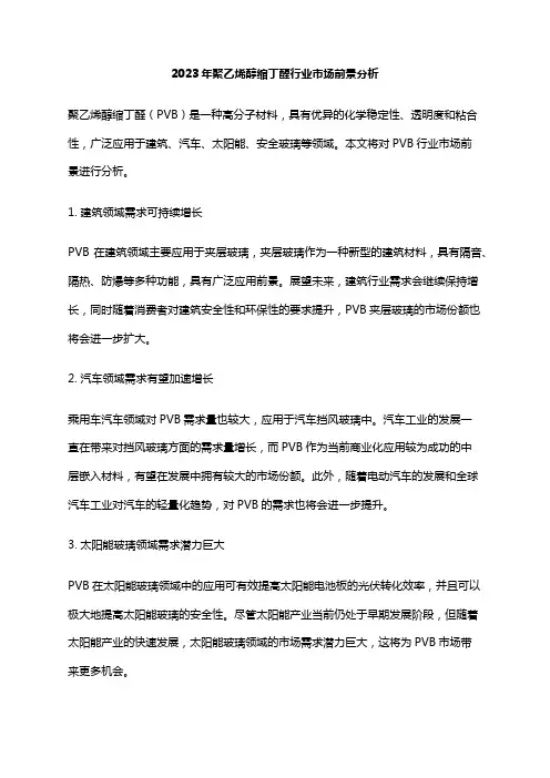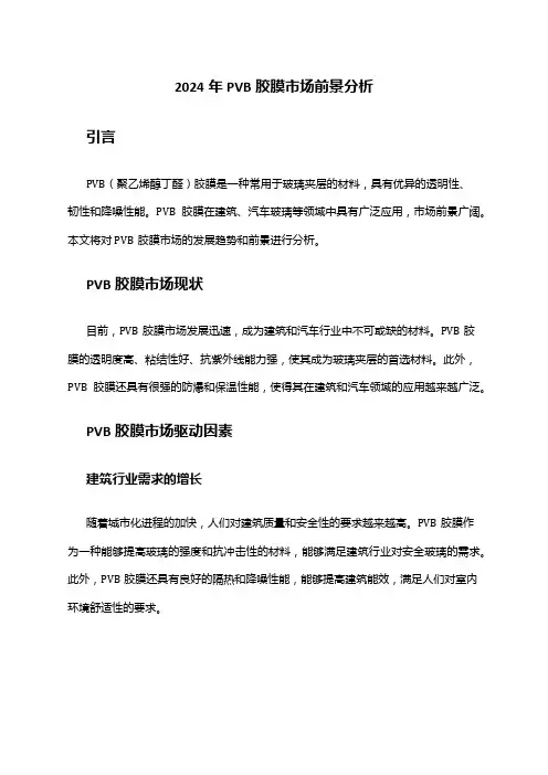 2024年PVB胶膜市场前景分析引言PVB(聚乙烯醇丁醛)胶膜是一种常用于玻璃夹层的材料,具有优异的透明性、韧性和降噪性能。
