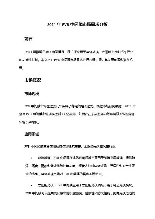 2024年PVB中间膜市场需求分析前言PVB(聚醋酸乙烯)中间膜是一种广泛应用于建筑玻璃、太阳能光伏和汽车行业的功能性材料。