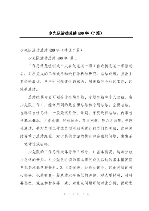 少先队队日活动总结范文7篇篇1一、活动概述本次少先队队日活动于XXXX年XX月XX日在学校体育场隆重举行,活动以“传承红色基因,争做新时代好少年”为主题,旨在通过一系列丰富多彩的活动,加强少先队员们的爱国主义教育和革命传统教育,激发少先队员们的集体荣誉感和组织归属感。