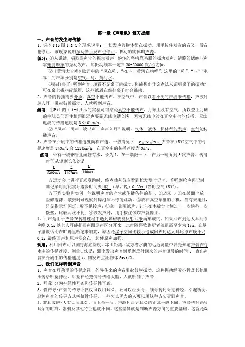 初二物理上册知识重难点(人教版)第一章声现象基础知识回声测距离:2s=vt第一节:声音的产生与传播一:声音的产生重点定义:1声是由物体的振动产生的2振动可以发声要点:1一切发声的物体都在振动2声音是由物体的振动产生的3发生物体的振动停止,发生也停止疑点:1一切正在发声的物体都在振动,固体,液体,气体都可以因振动而产生声音。