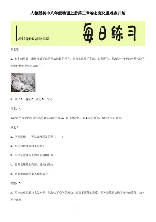 2、下列措施中,可以减慢蒸发的是()A.用电热吹风机将头发吹干B.用扫帚把地面上的水向周围扫开C.将湿衣服晾到向阳、通风的地方D.将新鲜的蔬菜装入保鲜袋中答案:DA.用电热吹风机将头发吹干,风加快了空气的流动,提高了液体的温度,两种措施都加快了液体的蒸发,故A 不合题意;B.将地面的水扫开,增大了液体的表面积,加快了液体的蒸发,故B不合题意;C.把湿衣服晾到向阳、通风的地方提高了液体的温度,风加快了空气的流动,两种措施都加快了液体的蒸发,故C不合题意;D.将蔬菜用塑料袋包起来,减慢了蔬菜周围的空气流动,从而减慢了液体的蒸发,故D符合题意。