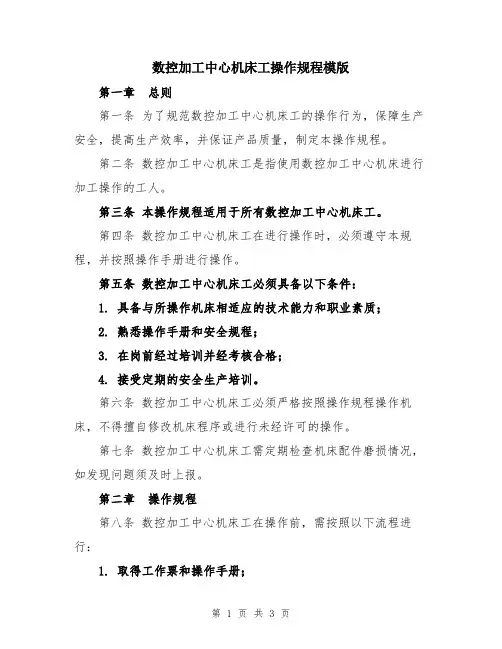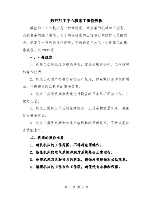数控加工中心机床工操作规程范文第一章总则第一条为了规范数控加工中心机床工的操作行为,确保操作安全,提高工作效率,制定本规程。