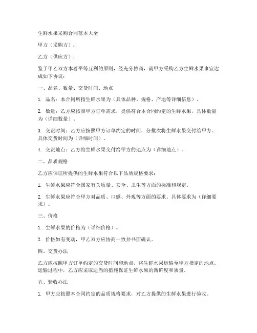 日期:乙方(盖章):第2篇示例:新版水果采购合同书甲方(采购方):_________乙方(供应方):_________根据双方平等自愿的原则,甲乙双方就水果采购事宜达成如下协议,以避免不必要的纠纷,维护双方的合法权益,特订立本合同。