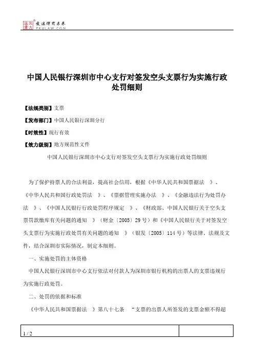 中国人民银行贵阳中心支行空头支票行政处罚实施细则(试行)第一章总则第一条为了维护持票人的合法权益,提高社会信用,维护票据的正常使用、流通。