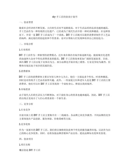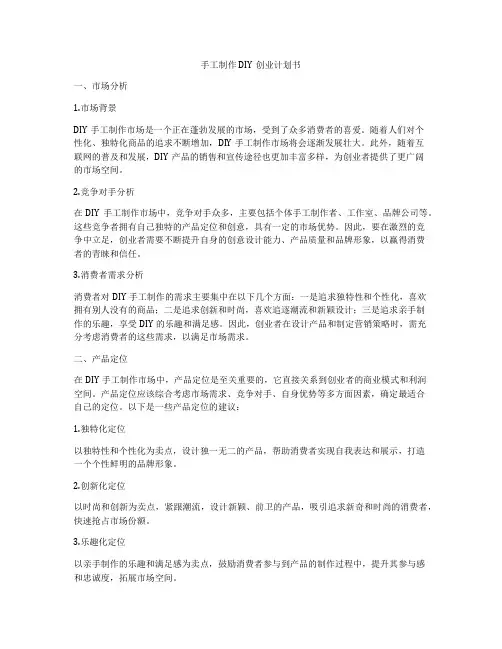 手工制作DIY创业计划书一、市场分析1.市场背景DIY手工制作市场是一个正在蓬勃发展的市场,受到了众多消费者的喜爱。