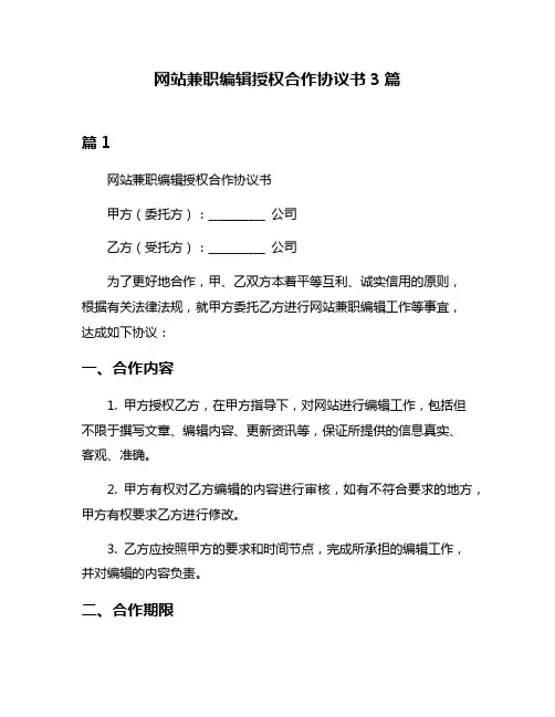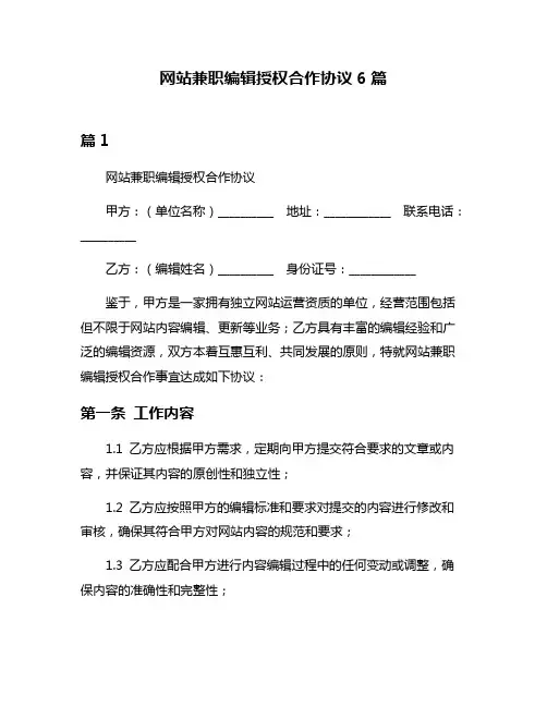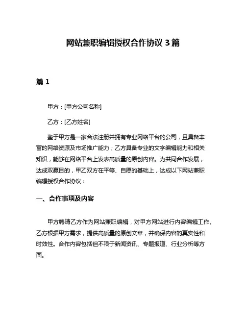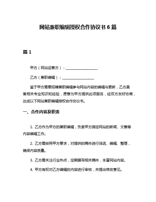 二、授权范围及合作期限1. 甲方授权乙方在合作期间担任兼职编辑角色,负责网站内容的编辑工作。