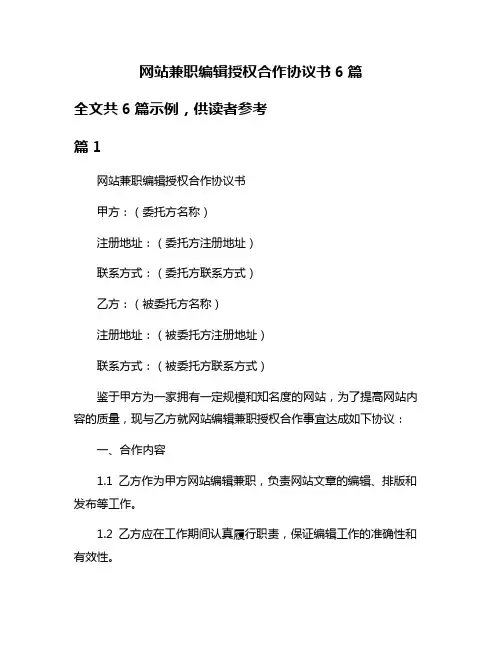 网站兼职编辑授权合作协议书6篇全文共6篇示例,供读者参考篇1网站兼职编辑授权合作协议书甲方:(委托方名称)注册地址:(委托方注册地址)联系方式:(委托方联系方式)乙方:(被委托方名称)注册地址:(被委托方注册地址)联系方式:(被委托方联系方式)鉴于甲方为一家拥有一定规模和知名度的网站,为了提高网站内容的质量,现与乙方就网站编辑兼职授权合作事宜达成如下协议:一、合作内容1.1 乙方作为甲方网站编辑兼职,负责网站文章的编辑、排版和发布等工作。