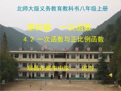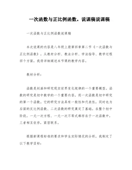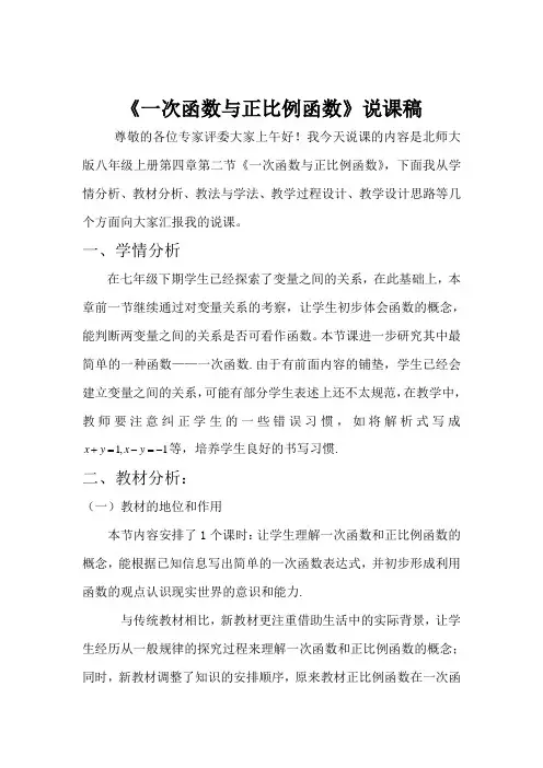 北师大版八年级数学上册:4.2《一次函数与正比例函数》说课稿一. 教材分析《一次函数与正比例函数》这一节的内容,主要出现在北师大版八年级数学上册第4章第2节。
