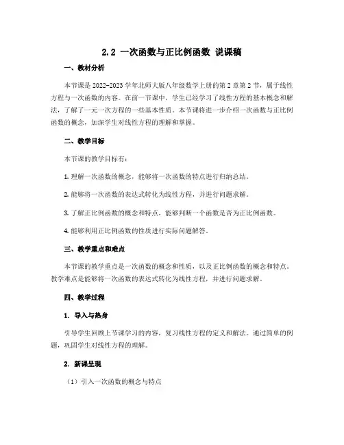 2.2 一次函数与正比例函数说课稿一、教材分析本节课是2022-2023学年北师大版八年级数学上册的第2章第2节,属于线性方程与一次函数的内容。