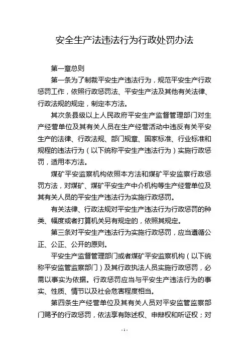 安全生产法违法行为行政处罚办法第一章总则第一条为了制裁平安生产违法行为,规范平安生产行政惩罚工作,依照行政惩罚法、平安生产法及其他有关法律、行政法规的规定,制定本方法。