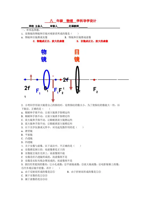 八 年级 物理 学科导学设计 学校 主备人 审核人 任课教师一、单项选择题:1.显微镜的物镜和目镜对观察者所成的像是( )A .物镜和目镜都成实像B .物镜和目镜都成虚像C .物镜成正立、放大的虚像D .目镜成正立、放大的虚像2.小明同学用放大镜看自己的指纹时,觉得指纹的像太小。