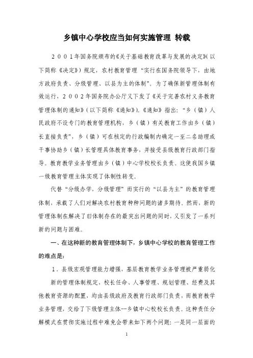 乡镇中心学校应当如何实施管理转载2001年国务院颁布的《关于基础教育改革与发展的决定》(以下简称《决定》)规定,农村教育管理‚实行在国务院领导下,由地方政府负责、分级管理、以县为主的体制‛。