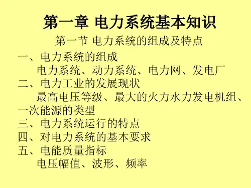 二、电力系统的组成1. 发电厂发电厂是电力系统的起源,根据能源的不同可以分为煤电厂、水电厂、核电厂、风电厂、太阳能发电厂等。