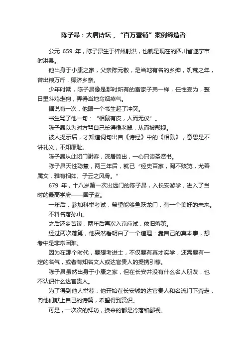 陈子昂的故事话说在唐朝初期,有一个怀揣着一腔抱负的热血青年远从千里之外的四川来到了都成长安,在当时的社会背景下,他把自己的诗作,文集送给了有名的达官显贵、名人墨客,想要谋取个一官半职,一展宏图,但是事与愿违,并没有人欣赏他,反而受到了诸多的嘲讽,这个人就是陈子昂。