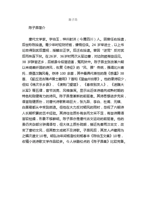 唐代诗人陈子昂生平简介陈子昂是唐代著名的诗人,也是文学家,字伯玉。