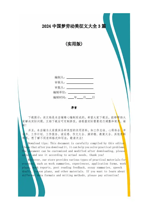 2024中国梦劳动美征文大全3篇(实用版)编制人:__________________审核人:__________________审批人:__________________编制单位:__________________编制时间:____年____月____日序言下载提示:该文档是本店铺精心编制而成的,希望大家下载后,能够帮助大家解决实际问题。