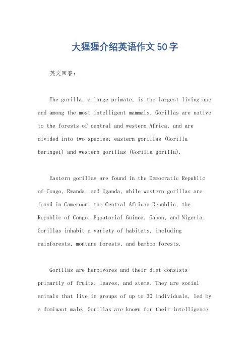 大猩猩介绍英语作文50字英文回答:The gorilla, a large primate, is the largest living ape and among the most intelligent mammals. Gorillas are native to the forests of central and western Africa, and are divided into two species: eastern gorillas (Gorilla beringei) and western gorillas (Gorilla gorilla).Eastern gorillas are found in the Democratic Republic of Congo, Rwanda, and Uganda, while western gorillas are found in Cameroon, the Central African Republic, the Republic of Congo, Equatorial Guinea, Gabon, and Nigeria. Gorillas inhabit a variety of habitats, including rainforests, montane forests, and bamboo forests.Gorillas are herbivores and their diet consists primarily of fruits, leaves, and stems. They are social animals that live in groups of up to 30 individuals, led by a dominant male. Gorillas are known for their intelligenceand tool use, and they have been observed using sticks to dig for food, and rocks to break open nuts.中文回答:大猩猩是一种体型硕大的类人猿,是现存最大的猿类,也是智力最高的哺乳动物之一。