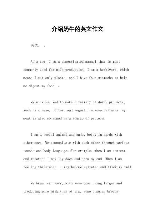 My milk is used to make a variety of dairy products, such as cheese, butter, and yogurt. In some cultures, my meat is also consumed as a source of protein.I am a social animal and enjoy being in herds withother cows. We communicate with each other through various sounds and body language. For example, when I am contentand relaxed, I may lay down and chew my cud. When I am feeling threatened, I may become agitated and flick my tail.My breed can vary, with some cows being larger and producing more milk than others. Some popular breedsinclude Holstein, Jersey, and Guernsey.Overall, I am an important animal in agriculture and provide many products for human consumption. 。
