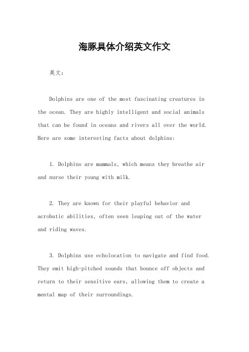 海豚特性介绍英文作文英文:Dolphins are highly intelligent marine mammals that are known for their playful and social behavior. They are part of the family Delphinidae, which includes over 40 different species. Dolphins are found in oceans and rivers all over the world and are known for their acrobatic abilities, such as jumping out of the water and spinning in the air.One of the most unique characteristics of dolphins is their communication skills. They use a variety of clicks, whistles, and body language to communicate with each other. These sounds can travel long distances underwater and are essential for finding food, avoiding predators, and socializing with other dolphins.Dolphins are also known for their curiosity and playful nature. They are often seen swimming alongside boats and surfing the waves. They have been known to play withobjects such as seaweed, sticks, and even plastic bags. Dolphins are also known to be very social animals and often travel in groups called pods. These pods can range in size from just a few individuals to hundreds of dolphins.In addition to their playful behavior, dolphins are also highly intelligent animals. They have been observed using tools and solving complex problems. For example, some dolphins have been seen using sponges to protect their noses while foraging for food on the ocean floor.Overall, dolphins are fascinating animals that continue to captivate and intrigue people all over the world.中文:海豚是一种高度智能的海洋哺乳动物,以其活泼和社交行为而闻名。