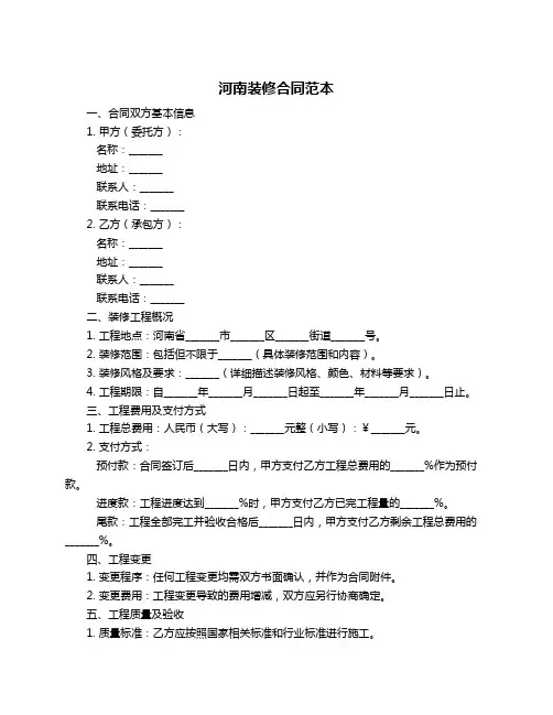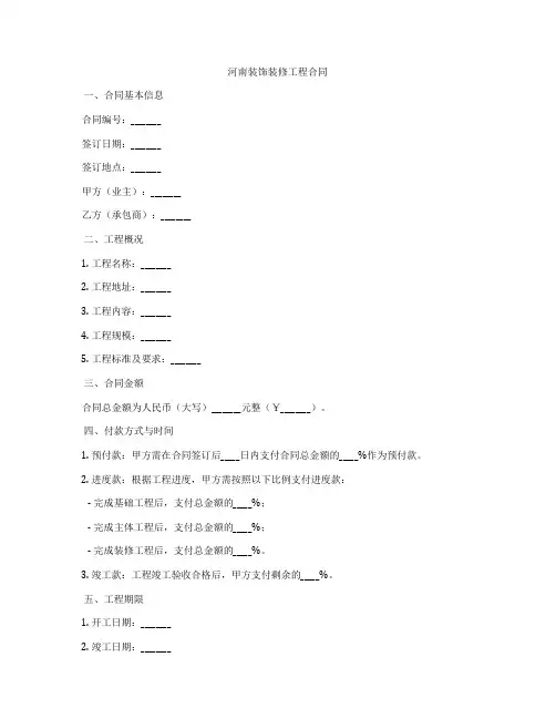 河南装饰装修合同范本甲方(发包方):____________________法定代表人:____________________地址:____________________联系方式:____________________乙方(承包方):____________________法定代表人:____________________地址:____________________联系方式:____________________一、工程概况1. 工程地点:____________________2. 工程内容:____________________(详见工程预算表及施工图纸)3. 工程承包方式:____________________(包工包料/包工不包料)4. 工程期限:自______年____月____日开工,至______年____月____日竣工,工期共计______天。