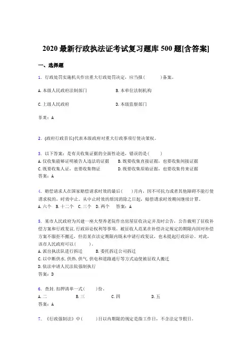 2020最新行政执法证考试复习题库500题[含答案] 一、选择题1.行政处罚实施机关作出重大行政处罚决定,应当报( )备案。