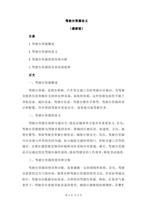驾驶台资源会义(最新版)目录1.驾驶台资源概述2.驾驶台资源的意义3.驾驶台资源的使用和分配4.驾驶台资源的未来发展趋势正文一、驾驶台资源概述驾驶台资源,是指在船舶、汽车等交通工具的驾驶台区域内,为驾驶员提供信息和操作支持的各种设备、系统和资源。