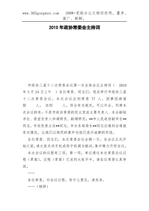 2010年政协常委会主持词市政协三届十二次常委会议第一次全体会议主持词(2010年3月24日上午)各位常委、同志们:现在举行市政协三届十二次常委会议。