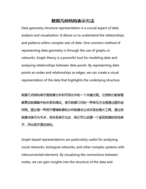 数据几何结构表示方法Data geometry structure representation is a crucial aspect of data analysis and visualization. It allows us to understand the relationships and patterns within complex sets of data. One common method of representing data geometry is through the use of graphs or networks. Graph theory is a powerful tool for modeling data and analyzing relationships between data points. By representing data points as nodes and relationships as edges, we can create a visual representation of the data that highlights the underlying structure.数据几何结构表示是数据分析和可视化中的一个关键方面。