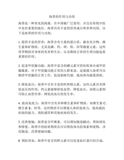 二、海带的功效及应用1. 保护甲状腺功能:海带是天然的碘源,能够维护甲状腺正常的分泌功能。