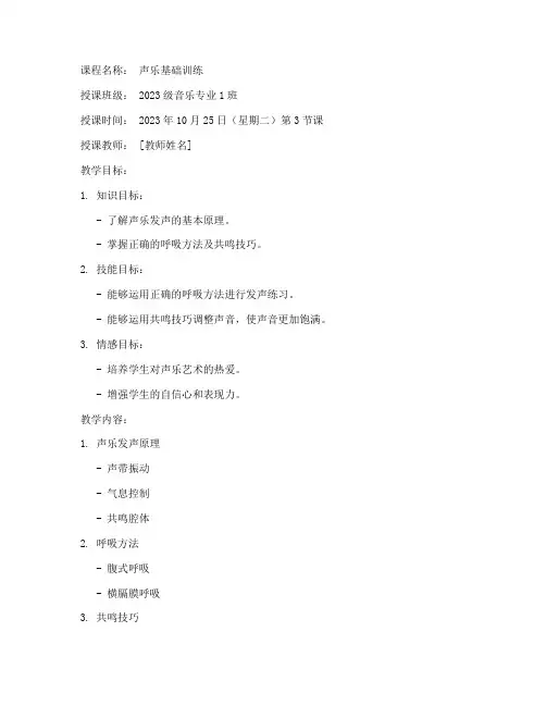 课程名称:声乐基础训练授课班级:高一(1)班授课时间: 2023年10月26日(周四)第3节课教学目标:1. 知识目标:了解声乐的基本概念,掌握正确的发声方法,熟悉呼吸控制技巧。