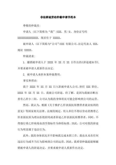 非法辞退劳动仲裁申请书模板尊敬的劳动仲裁委员会:我是某公司的一名员工,我在此向贵委员会提出一份非法辞退劳动仲裁申请。