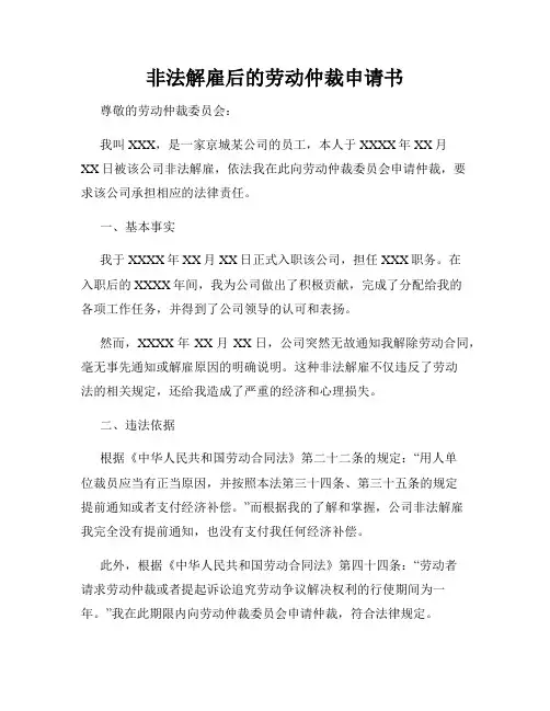 非法解雇后的劳动仲裁申请书尊敬的劳动仲裁委员会:我叫XXX,是一家京城某公司的员工,本人于XXXX年XX月XX日被该公司非法解雇,依法我在此向劳动仲裁委员会申请仲裁,要求该公司承担相应的法律责任。