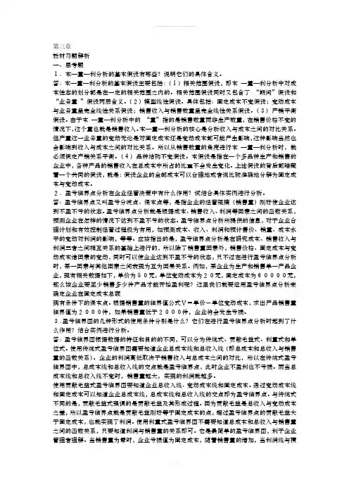 2、本量利分析的基本假设包括哪些内容?答:本量利分析一般有以下几方面的假设:1.成本性态分析假设本量利分析必须在成本性态分析已经完成的基础上进行,即假设本量利分析所涉及的成本因素已经区分为变动成本和固定成本两类,相关的成本性态模型已经形成。