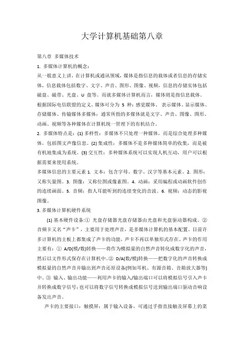 大学计算机基础第八章第八章多媒体技术1. 多媒体计算机的概念:从一般意义上讲,在计算机或通讯领域,媒体是指信息的载体或者信息的存储实体,信息载体包括数字、文字、声音、图形、图像、视频,信息的存储实体包括磁盘、磁带、光盘、U 盘等。