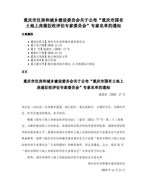 重庆市住房和城乡建设委员会关于公布“重庆市国有土地上房屋征收评估专家委员会”专家名单的通知