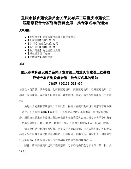 重庆市城乡建设委员会关于发布第三届重庆市建设工程勘察设计专家咨询委员会第二批专家名单的通知