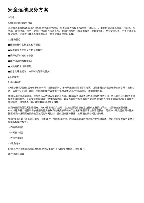 安全运维服务⽅案1概述1.1服务范围和服务内容本次服务范围为XX局信息化系统硬件及应⽤系统,各类软硬件均位于XX局第⼀办公区内,主要包括计算机终端、打印机、服务器、存储设备、⽹络(安全)设备以及应⽤系统。