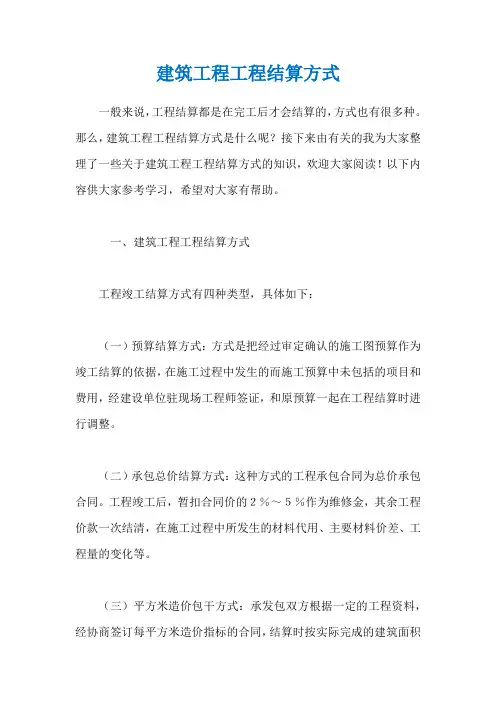 一、建筑工程工程结算方式工程竣工结算方式有四种类型,具体如下:(一)预算结算方式:方式是把经过审定确认的施工图预算作为竣工结算的依据,在施工过程中发生的而施工预算中未包括的项目和费用,经建设单位驻现场工程师签证,和原预算一起在工程结算时进行调整。