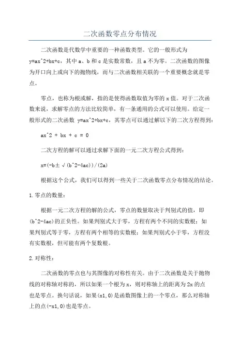 给定一般形式的二次函数y=ax^2+bx+c,其零点可以通过解以下的二次方程得到:ax^2 + bx + c = 0二次方程的解可以通过求解下面的一元二次方程公式得到:x=(-b±√(b^2-4ac))/(2a)根据这个公式,我们可以得到一些关于二次函数零点分布情况的结论。